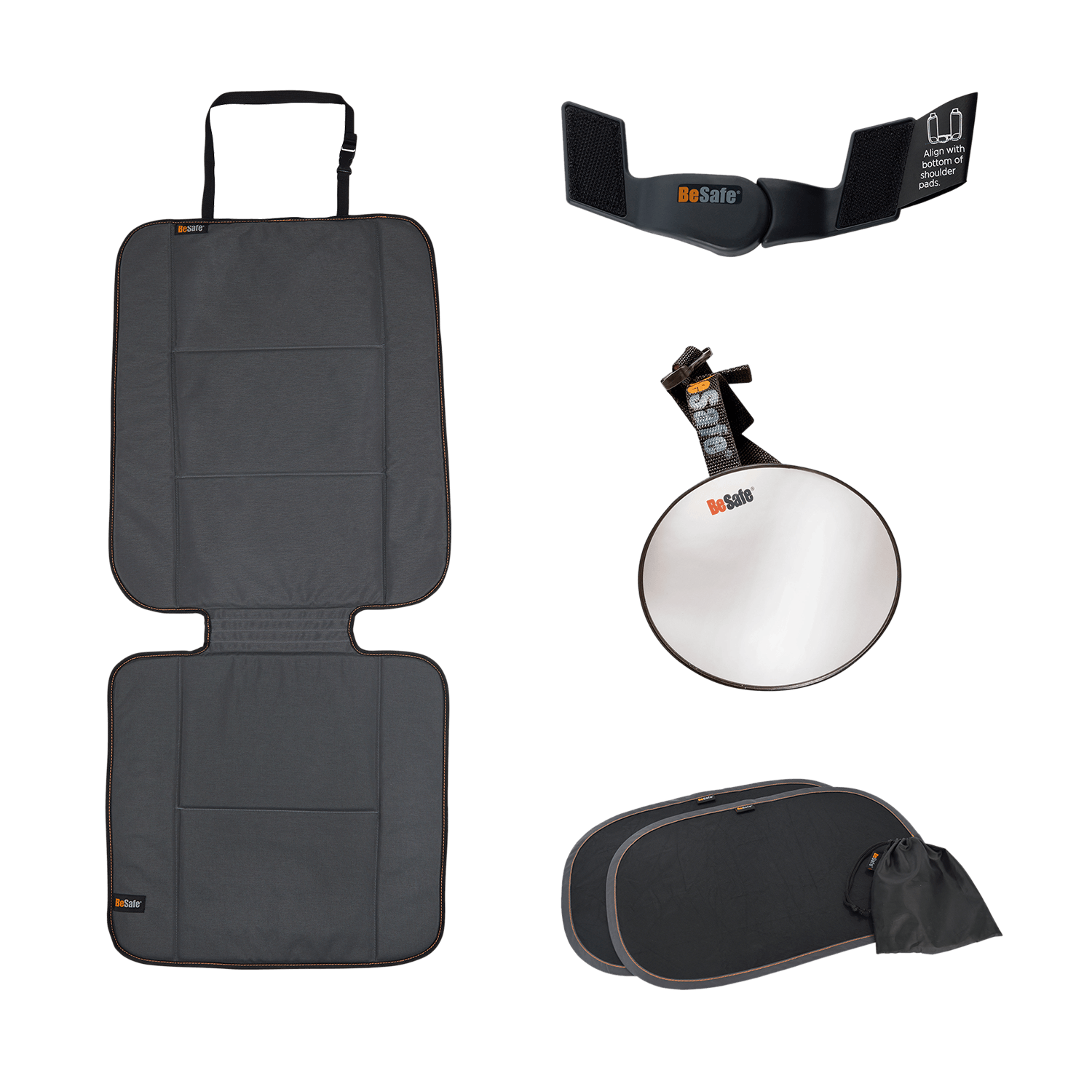 BeSafe Baby Mirror allows you to keep an eye on your rear facing child while driving. BeSafe Belt Guard holds the shoulder belts of the child car seat safely together, preventing your child from wriggling their way out of the belts.